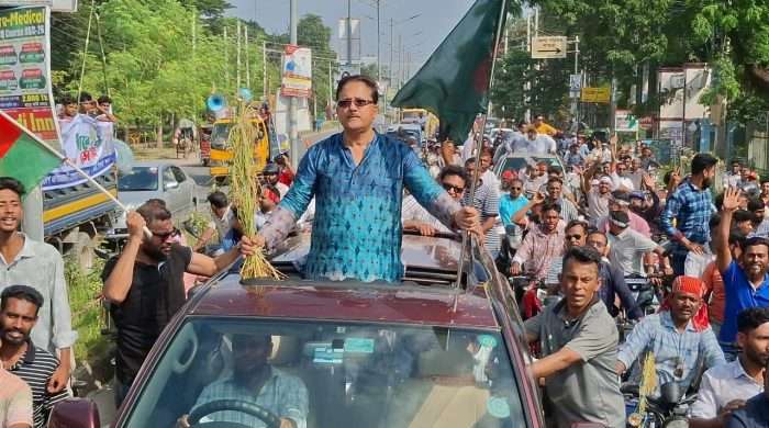 মাগুরা-১ আসনে বিএনপি প্রার্থী মনোয়ার হোসেন খানকে শুভেচ্ছা জানিয়ে আনন্দ মিছিল