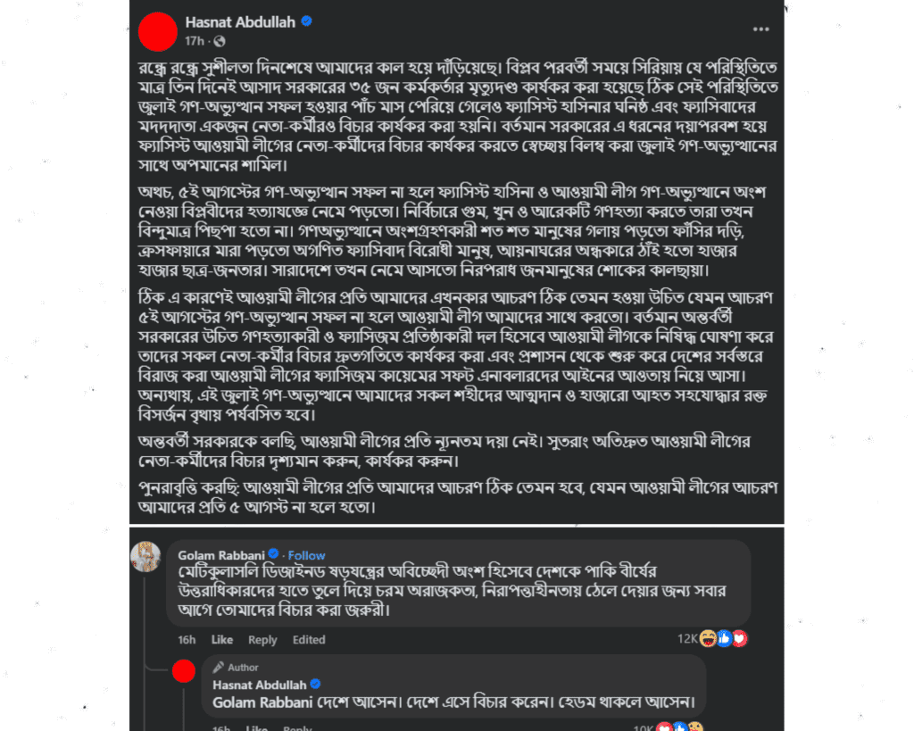 সম্প্রতি বৈষম্যবিরোধী ছাত্র আন্দোলনের সমন্বক হাসনাত আব্দুল্লাহ সামাজিক যোগাযোগ মাধ্যম ফেসবুকে জুলাই আগস্টে গন হত্যার বিচার নিয়ে একটি পোস্ট শেয়ার করেন। সেখানে তিনি লিখেন, বর্তমান সরকারের দয়াপরবশ কারণে আওয়ামী লীগ নেতা কর্মীদের বিচার বিলম্ব হচ্ছে যা, জুলাই গণ-অভ্যত্থানের সাথে অপমানের শামিল। তিনি আরও লিখেন, সিরিয়ায় সরকারের পতনের পর আসাদ সরকারের সহচারীদের ৩ দিনের মাথায় মৃত্যুদণ্ড কর্যকর হয়েছে। অথচ গণ-অভ্যুত্থানের পাঁচ মাস হয়ে গেলো এখনো ফ্যাসিস্ট হাসিনা ও ফ্যাসিবাদের একজন নেতা কর্মীদেরও বিচার কার্যকর করা হয়নি।