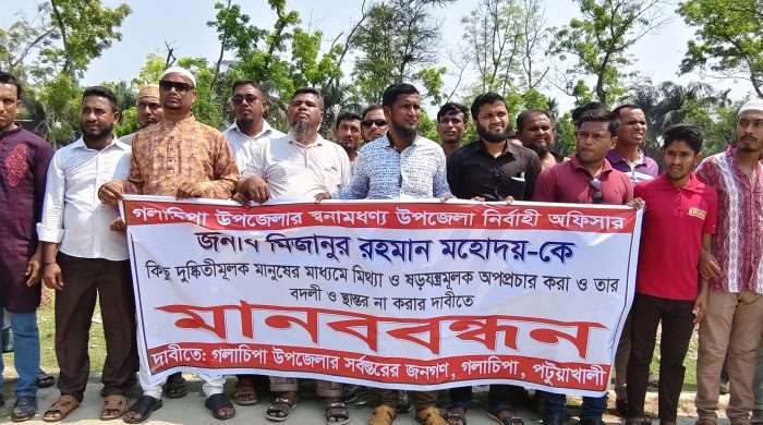 পটুয়াখালীর গলাচিপায় ইউএনও’র বিরুদ্ধে ষড়যন্ত্র মূলক মিথ্যা অপপ্রচার বন্ধের দাবিতে মানববন্ধন করেন উপজেলার সর্বস্তরের মানুষ। বৃহস্পতিবার (১৩ মার্চ) দুপুর ১২টা নাগাদ উপজেলা পরিষদ চত্তরে ঘন্টাব্যাপী এ মানববন্ধন ও মিছিল করেন।