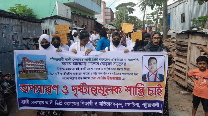কেরামত আলী কলেজ ছাত্রদলের সভাপতি মোকসেদুল ইসলাম বলেন, অবৈধভাবে নিয়োগ পাওয়া অধ্যক্ষ আলীম উজজামানকে অপসারণ করে বিচারের আওতায় আনার দাবি জানাই। তার বিরুদ্ধে ব্যবস্থা না নিলে আমাদের আন্দোলন চলবে।